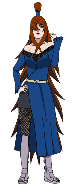 Dia memakai gaun lengan panjang, biru gelap yang jatuh tepat di bawah lutut. Tampaknya harus ditutup di depan dengan ritsleting, dan disimpan terbuka di sisi depan kanan dari pinggang ke bawah. Gaun hanya mencakup sampai bagian atas lengan dan bagian bawah payudaranya. Di bawahnya, ia mengenakan baju besi jala yang mencakup sedikit lebih dari bagian atas tubuhnya dari gaunnya. Dia juga memakai rok dalam warna yang sama dengan gaunnya dan, di bawah mereka, kaos kaki jala mencapai ke bawah lututnya. Di pinggang, ia mengenakan sabuk dengan kantong melekat pada bagian belakang di sebelah kiri bersama dengan sandal berhak tinggi dan pelindung kaki mencapai di atas lutut, cat biru gelap pada jari tangan dan kaki, dan biasanya ditunjukkan dengan lipstik ungu (fuchsia di anime).